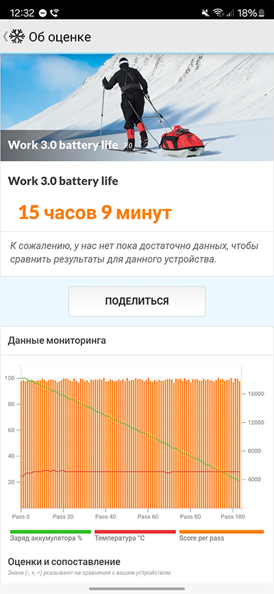 Синтетический тест PCMark - важный показатель. И вот тут получилось почти ровно столько же, сколько у S23 Ultra, хотя Интернет и видео здесь протянули в полтора раза дольше.