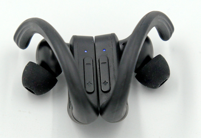 На верхней части каждого наушника располагается светодиод (красный - наушник заряжается, голубой - подключен, мерцает красный и голубой - режим сопряжения), также здесь еще по две кнопки управления на каждом наушнике. И я первый раз вижу TWS-наушники с кнопочным управлением, у которых по три кнопки на каждом наушнике.