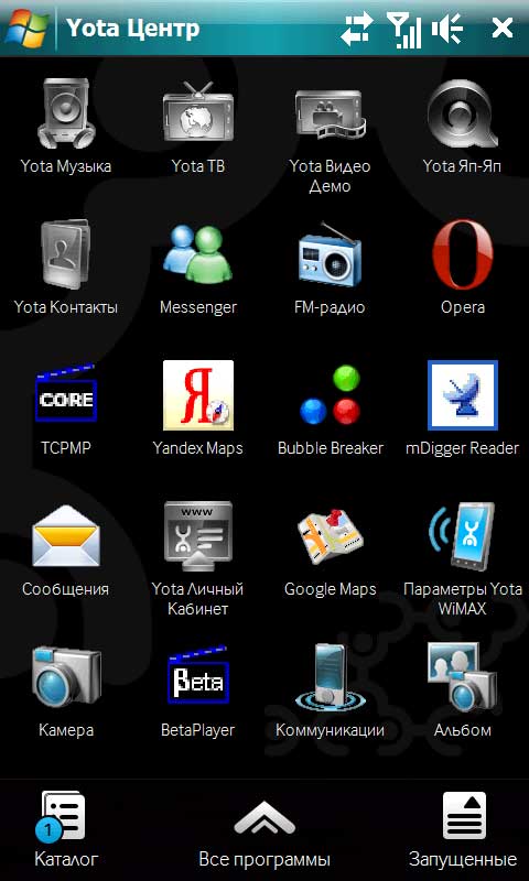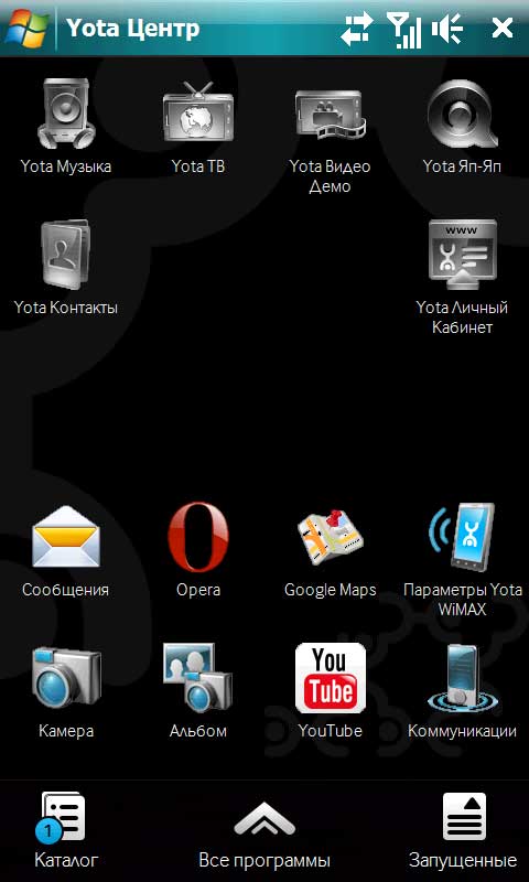Тут вроде все понятно. Сверху - пиктограммы приложений Yota. В центре - пустой газон для посадки цифровой травы (шучу, туда также можно добавить пиктограммы программ). Под ним - пиктограммы приложений. Под ними - ссылка на каталог программ Yota, вызов всех программ устройства, список запущенных в данный момент программ.