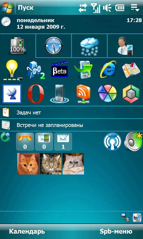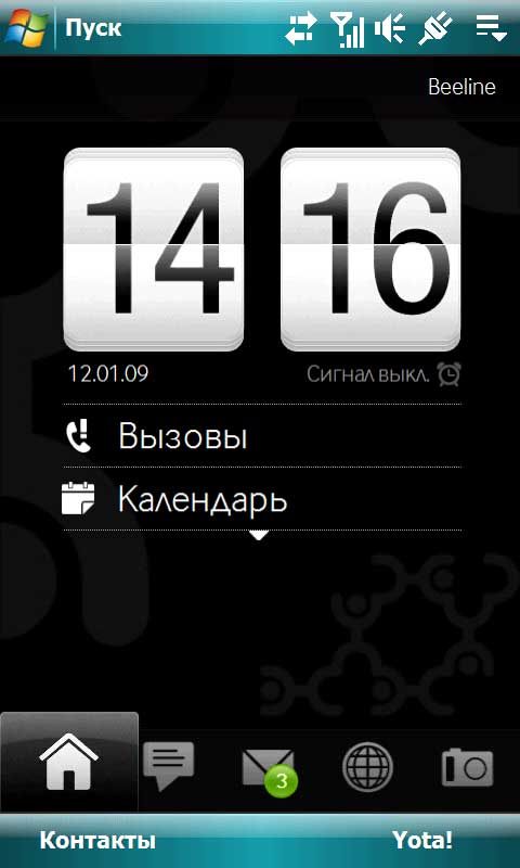 Всякие TouchFLO 3D и утилиты Yota - это, конечно, хорошо, но мы, продвинутые пользователи, меняющие коммуникаторы как перчатки, обычно предпочитаем свой собственный комплект программ. Поэтому я обычно выключаю все эти навороты, и у меня экран "Сегодня" выглядит примерно следующим образом.