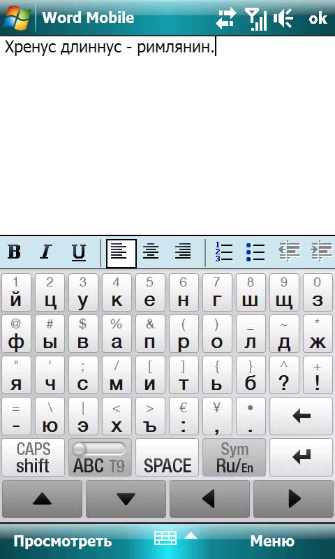 Несмотря на практически точно такой же экран, как у iPhone, добиться комфортного набора пальцами на клавиатуре здесь не получится, хотя что-то набрать наверняка удастся. В комплект входят стандартные клавиатуры Windows 6.1, но даже режим "Полная QWERTY" не позволит вам нормально набирать пальцами. (Впрочем, на мой взгляд, на iPhone быстро набирать текст пальцами также не получается.) Кроме того, в русском регистре клавиш получается больше (так как букв больше), поэтому нормально попадать по ним пальцами может только настоящий снайпер.