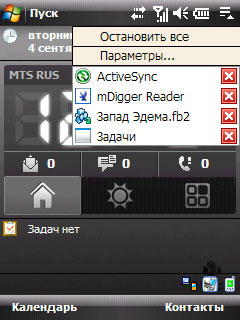 Проблема вторая - запущенные программы. Памяти у коммуникаторов немного, много программ в памяти держать не будешь, поэтому нужно иметь возможность быстро посмотреть, что там запущено, и при необходимости выгрузить какие-то из программ. Здесь это также делается базовыми средствами - достаточно щелкнуть стилом или пальцем на значок, расположенный в правом верхнем углу экрана. Перед вами появится менеджер запущенных задач, где можно остановить все программы или какие-то из них: