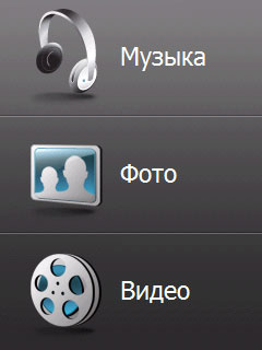 "Музыка" вызывает аудиоменеджер, "Фото" - оболочку просмотра изображений, "Видео" - оболочку просмотра видеозаписей.