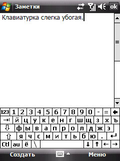 Alex Exler:Виртуальная клавиатура в HTC Touch могла бы быть и побогаче. Она совершенно примитивная и по раскладке, и по оформлению. Переключение на латиницу делается специальной кнопкой, которую не сразу и обнаружишь, если раньше с такой клавиатурой и не сталкивался, причем одиночный щелчок по клавише переключает раскладку только для ввода одного символа. Чтобы полностью переключить, надо по клавише щелкнуть пару раз. Ну и оформление, конечно, при таком классном дизайне и устройства, и оболочки, просто поражает своим убожеством.