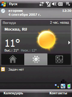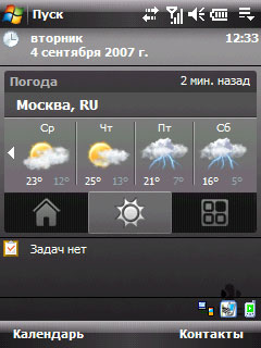 Надо сказать, что этот HTC Home удовлетворяет почти все возможные потребности быстрого допуска: первая панель дает ссылки на почту, SMS и телефон, вторая дает погоду, третья дает ссылки на часто используемые программы - это очень удобно, необходимость в Spb Pocket Plus при этом отпадает. Хотя замечу, что уж если придираться, то модуль погоды мог бы быть более удобным и продвинутым (например, показывать несколько городов), а модуль запуска хотелось бы иметь возможность расширять на хотя бы еще одну-две строки ссылок. Или расширять его с помощью дополнительных закладок, как в Spb Pocket Plus. Но это уже, конечно, придирки. HTC Home - очень удобная система.