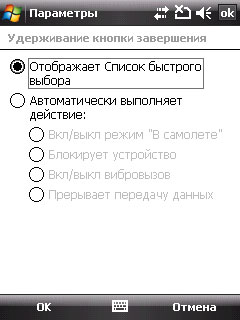 Появилась интересная дополнительная настройка удерживания кнопки завершения вызова. (В одной из старых версий Windows Mobile 2003, насколько я помню, это действие вызывало вырубание GPRS.)