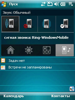 Если в HTC Touch система Home включает три закладки: звонки/SMS, погода и приложения, то здесь добавлена четвертая закладка - звуковые профили.
