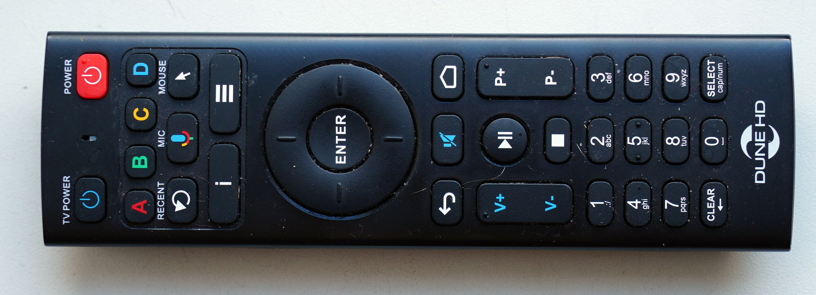 Пульт управления - стандартный дюновский. При этом он также может работать по Bluetooth, у него есть поддержка голосового поиска, режима AirMouse, и он имеет функцию ИК-обучения для телевизоров и другого оборудования. Мне пульты у Dune очень нравятся, они удобные. И хорошо что компания не прогибается под нынешнюю моду сокращать количество кнопок на пульте до двух-трех.