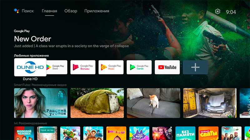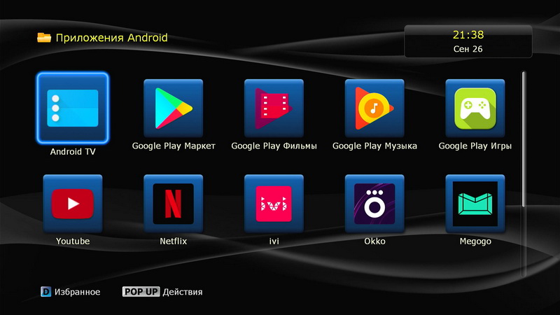 Приложения Android. Здесь, кроме Google Play Маркет и всяких популярных андроидных приложений, есть приложение Android TV, при запуске которого медиаплеер начинает работать под управлением Android TV.