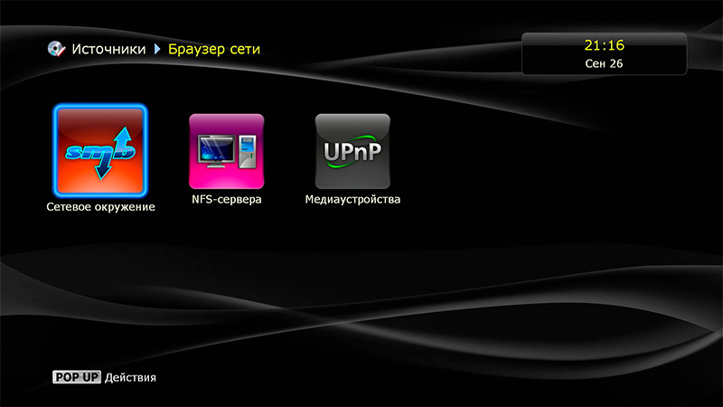 Браузер сети работает с различными Samba-серверами, NFS-серверами и устройствами UPnP.