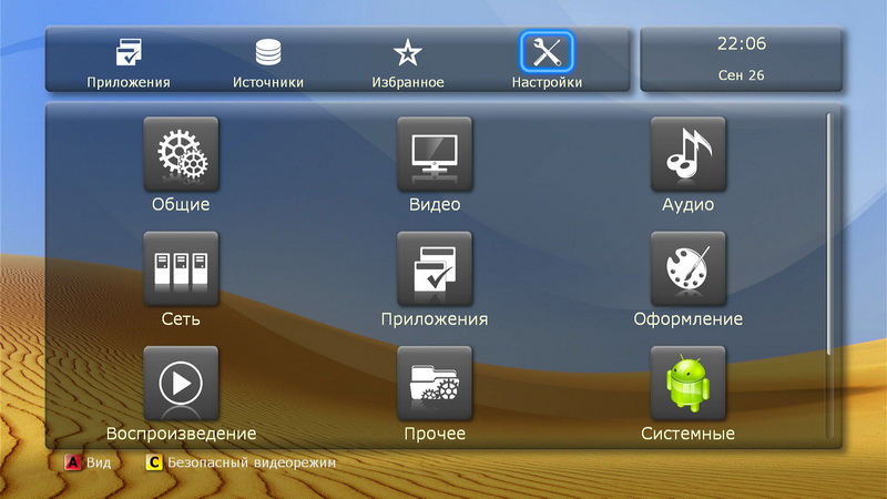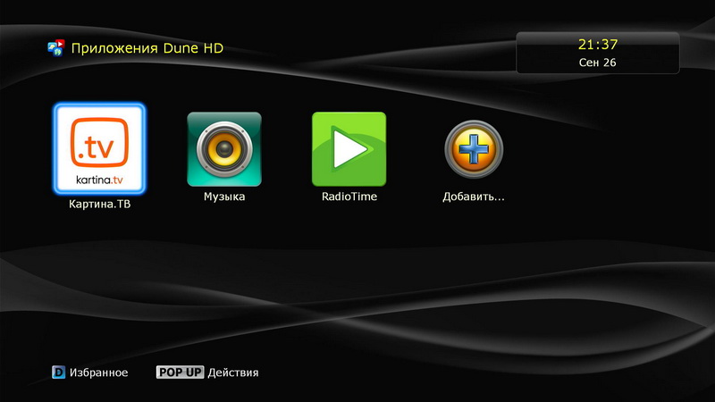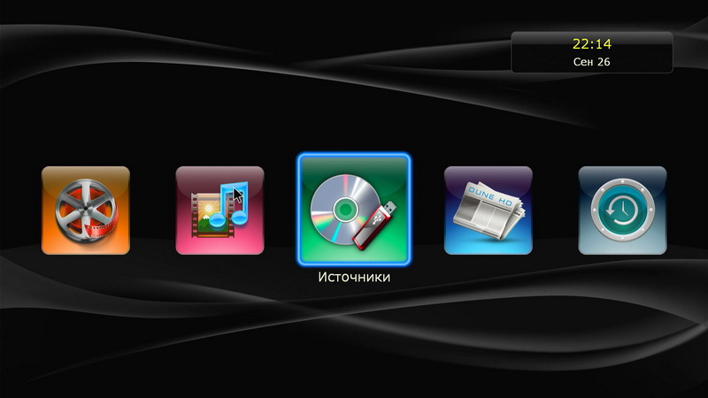 Основные пиктограммы: источники, информация Dune HD, последнее, избранное, настройки, моя коллекция, фильмы, ТВ, приложения Dune HD, приложения Android.