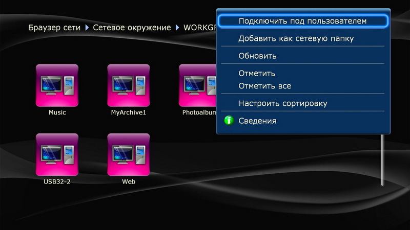 С сетевыми накопителями все очень удобно и наглядно: медиаплеер видит все сетевые устройства, расшаренные папки и подключенные через USB внешние накопители к этим сетевым устройствам.