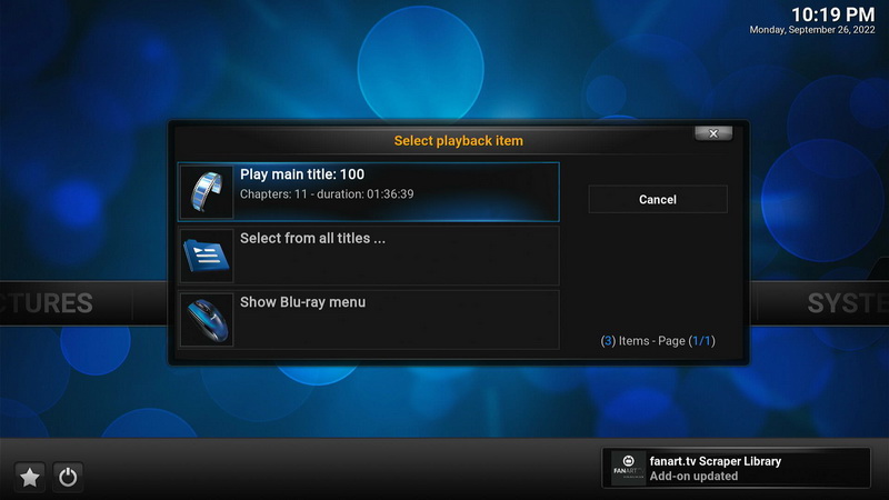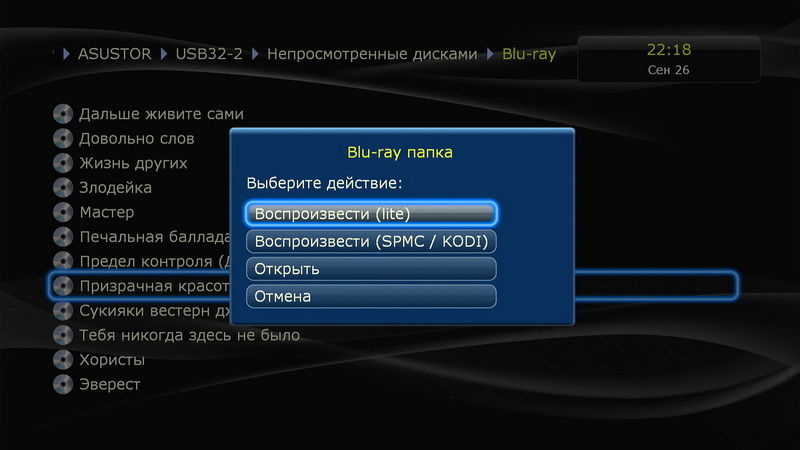 Плеер предлагает воспроизвести основной фильм или открыть диск через приложение SPMC.