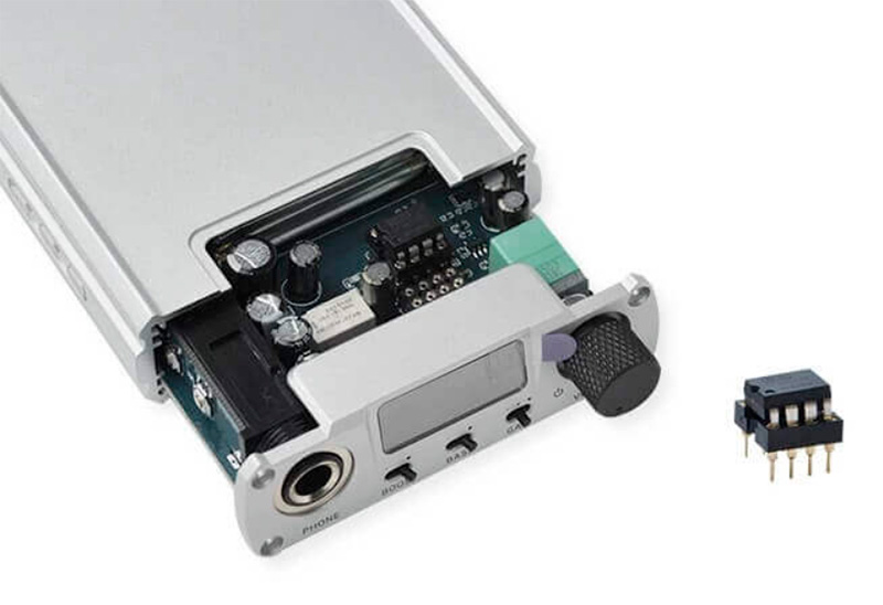 Операционные усилители здесь можно менять - соответственно, будет меняться звучание. Для замены нужно отвинтить четыре винта на лицевой части и сдвинуть кожух усилителя.
