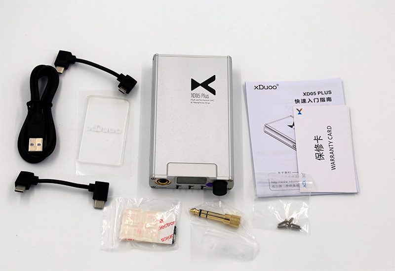 Комплектация тут богатая: усилитель, зарядный кабель USB A-C, кабель Type-C - Type-C, кабель Type-C - microUSB, переходник под аудиоджек 3,5 мм с выхода 6,3 мм, инструкция на английском и китайском, липкая силиконовая прокладка с надписью xDuoo, набор винтиков, десять пластиковых ножек с лентой 3М, гарантийный талон. Вот за кабели Type-C - Type-C и Type-C - microUSB для подключения к смартфонам и планшетам - отдельное спасибо.