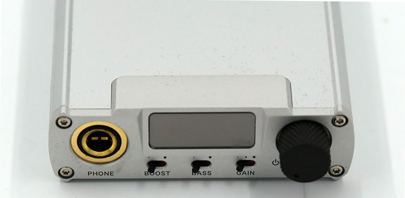 На передней панели - гнездо аудиовыхода 6,3 мм, переключатели дополнительного усиления, усиления баса, Gain (ступенчатый регулятор уровня мощности +6, +9, +15 dB), регулятор громкости (он же включает и выключает устройство).