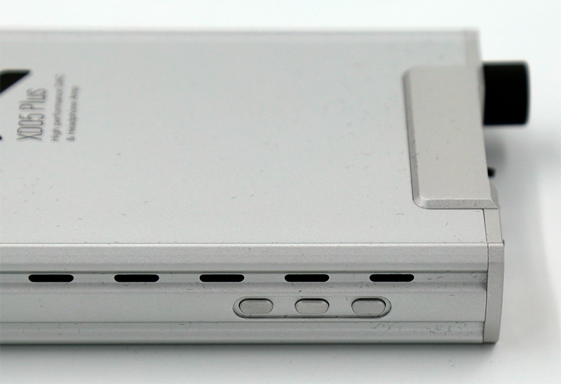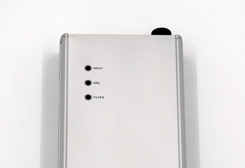 На левом торце - три кнопки, назначение которых написано на нижней крышке: Input, Src, Filter (выбор входа, управление режимами цифровых фильтров и апсемплинга аудио с помощью SRC-конвертера CS8422, фильтры).