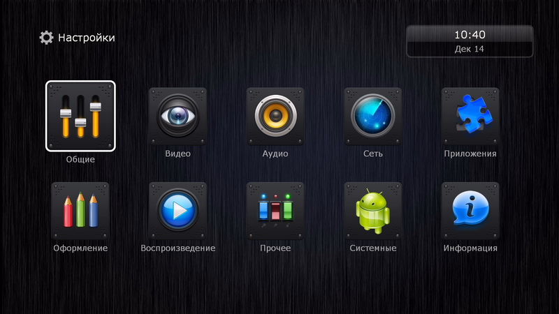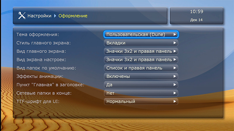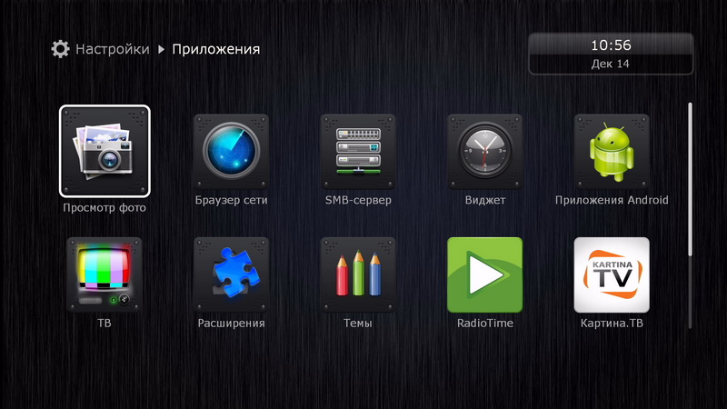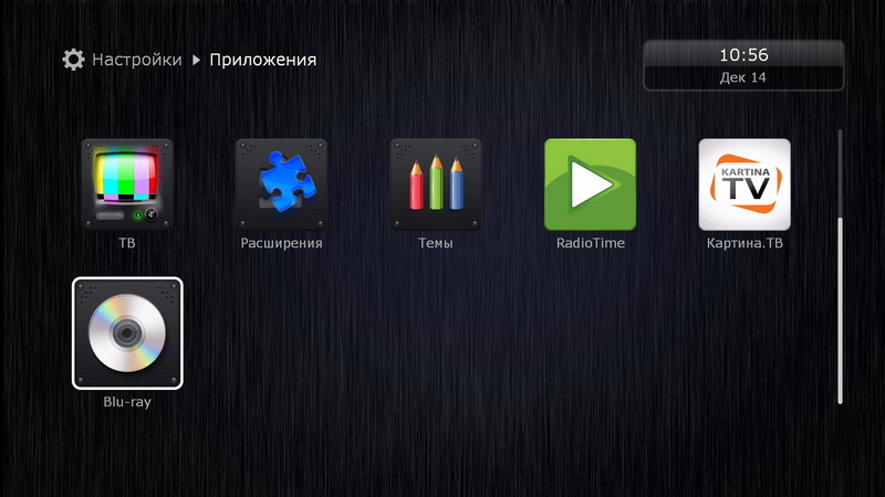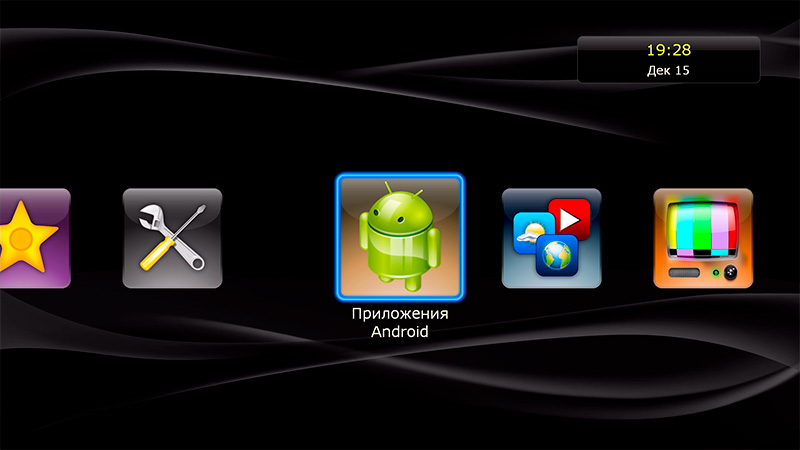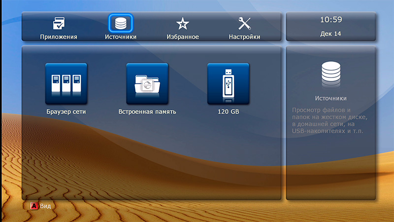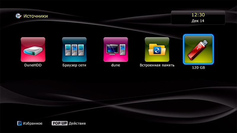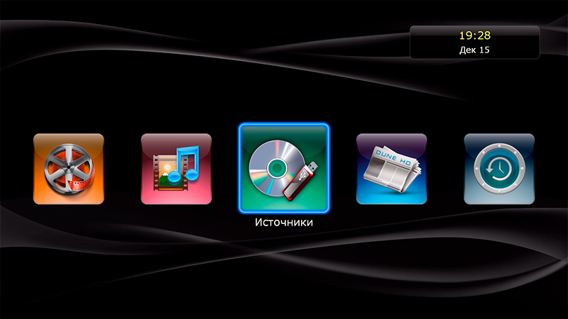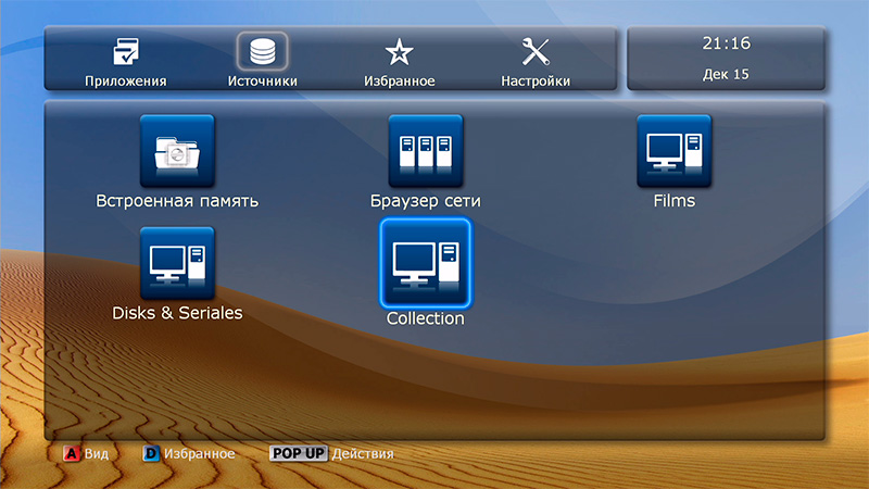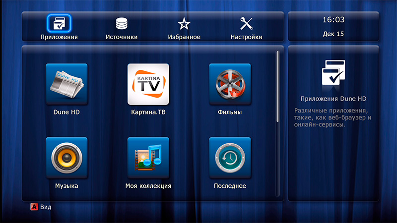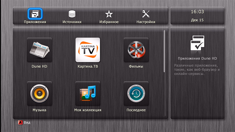 После загрузки появляется привычный дюновский интерфейс основных пиктограмм: источники медиаконтента, новости Dune HD, последние просмотренные (удобно для просмотра сериалов, там сразу видишь, какой эпизод смотрел перед этим), "Моя коллекция", фильмы, ТВ, приложения Dune HD, приложения Android, избранное и настройки.