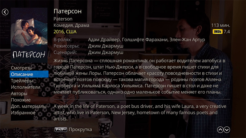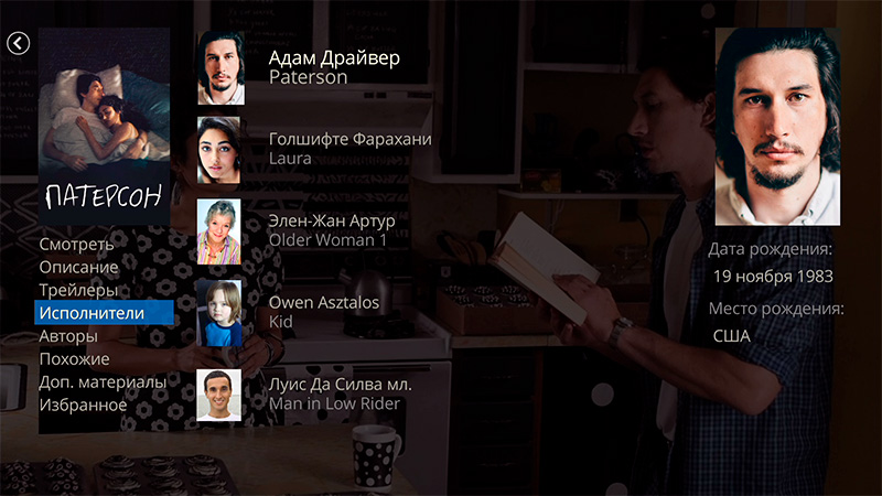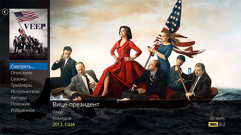 При нажатии на любой фильм любого формата плеер выводит обложку, кадр из фильма и кучу информации, которую он сам вытягивает из Интернета. Причем его не волнует, как называется файл (в данном случае он назывался "30 GB"): он информацию о названии берет из самого файла и находит для него информацию в Сети, где, кроме всего прочего, еще находит и трейлеры, и дополнительные материалы, и актеров, и создателей фильма и так далее. И это, скажу я вам, выглядит очень круто.