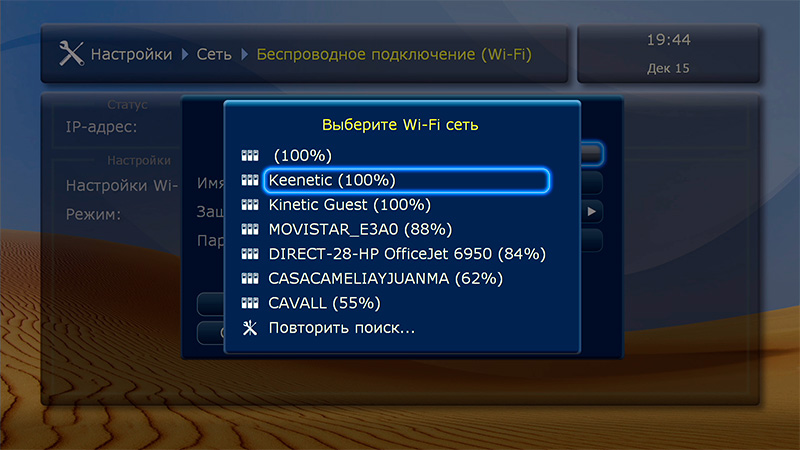 Плеер покажет доступные сети, нужно будет выбрать вид защиты и ввести пароль.
