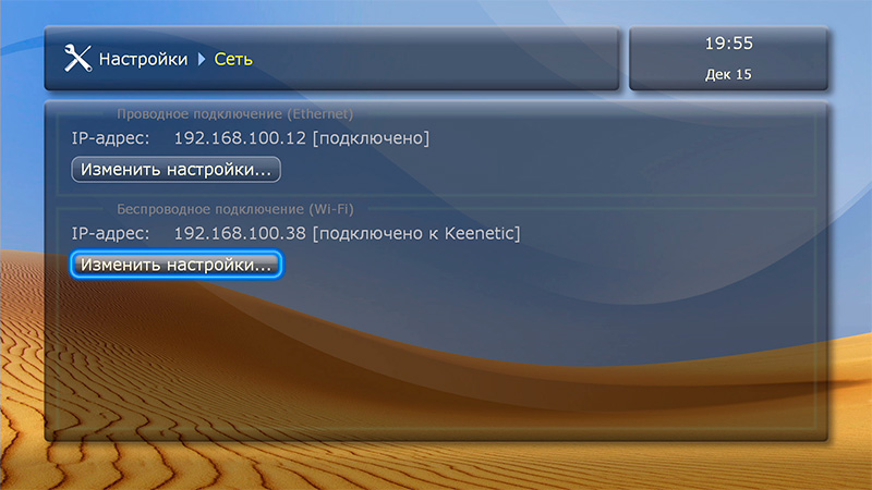 Тут, конечно, медиаплеер сразу хорошо бы подключить к локальной сети. Или подключаем кабелем, или настраиваем подключение к Wi-Fi - это делается в Настройки - Сеть.