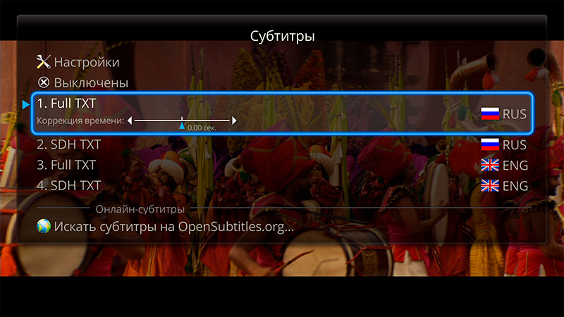 Настройка субтитров. Обратите внимание, что тут еще и можно искать субтитры в Интернете.