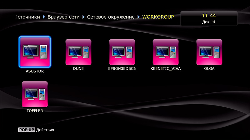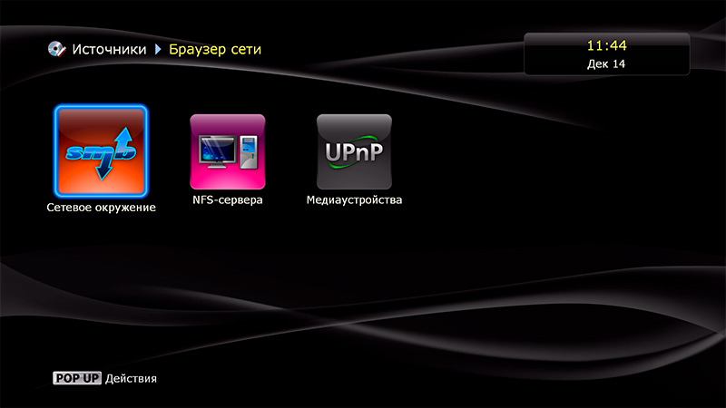 Заходим в Источники - Браузер сети. Здесь поддерживаются Samba-серверы Windows, NFS и UPnP-медиаустройства.