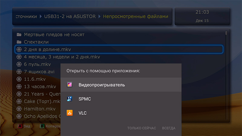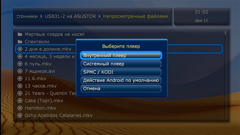 Причем заметьте, что если вы нажмете на фильме кнопку Pop Up, то там в меню будет пункт "Воспроизвести через" и там через "Действие Android по умолчанию" вы можете назначить любой плеер для воспроизведения, если вам по каким-то причинам не нравится встроенный (а он в Dune очень хорош, я его даже на VLC не хочу менять, которым я пользуюсь в андроидных медиаплеерах).