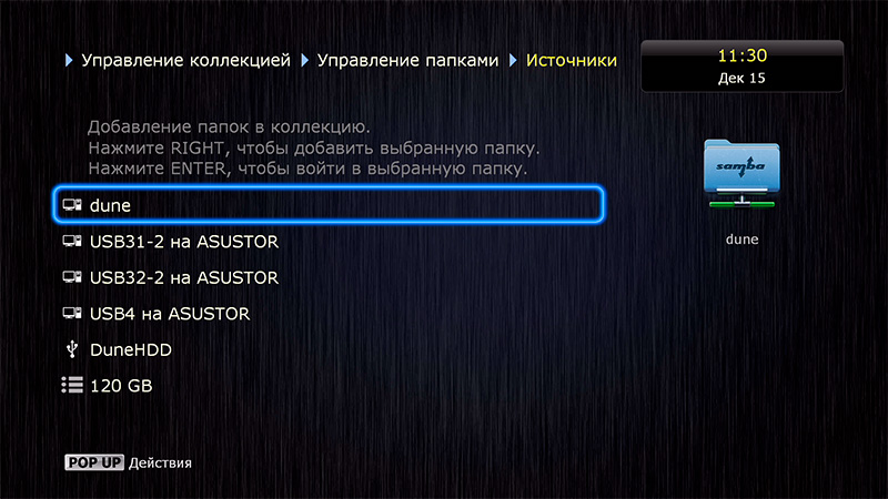 На самом деле делается это довольно просто. В списке расшаренных папок (подключенных к NAS дисков) на нужной папке нажимаете кнопкy Pop Up на пульте, после чего выбираете "Добавить как сетевую папку" и даете там удобное вам название.