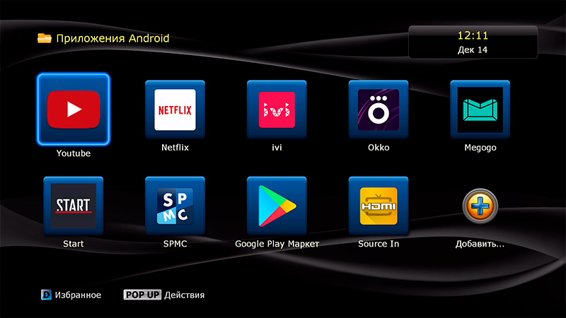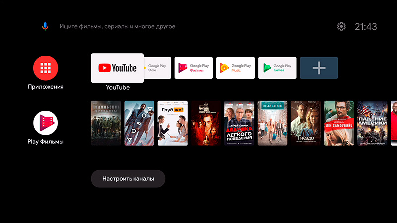 Да вообще какие угодно: Netflix, YouTube, "Картина.ТВ", Ivi и так далее. Это кроме того, что здесь есть вполне нормальный Google Play Market и из него устанавливаются любые приложения для Android TV (подчеркиваю - именно для Android TV).