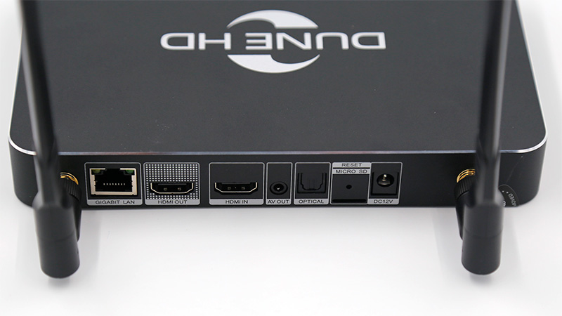 На задней грани - гигабитный Ethernet, HDMI Out, HDMI In, выход AV, оптический выход, слот microSD, кнопка Reset, вход адаптера питания.