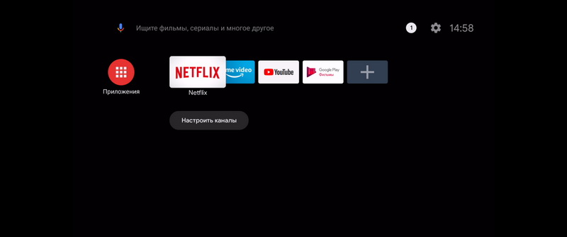 Ну и все, появляется главное окно программы. Интерфейс - стандартный Android TV. Настраиваемые каналы, окно приложений, голосовой поиск, настройки.