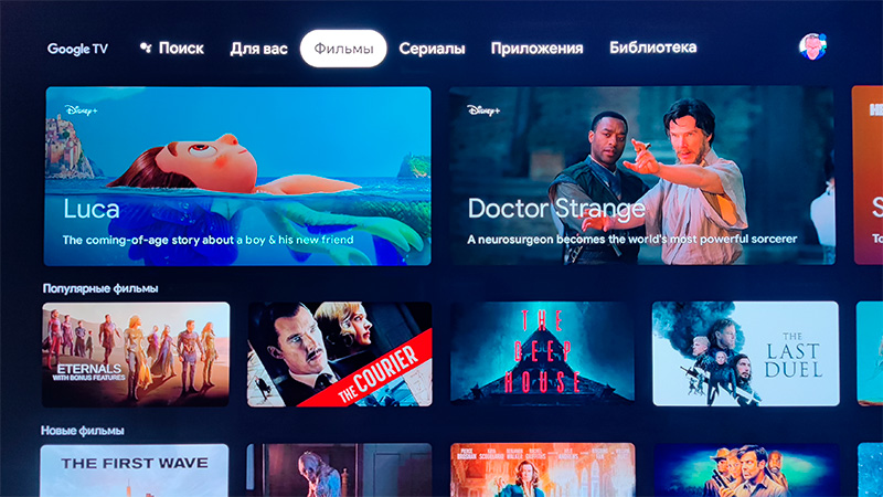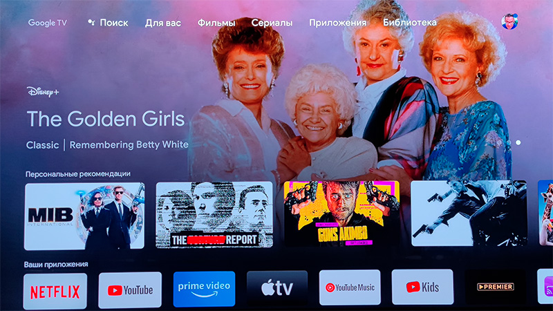 Стандартный десктоп Google TV. Есть поиск (в том числе голосовой через "Ассистента", и это поддерживается комплектным пультом), есть всякие рекомендации, фильмы, сериалы, приложения и библиотека.