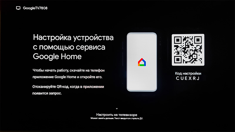 Медиаприставку можно настроить и на телевизоре, но намного проще запустить на смартфоне сервис Google Home, там добавить новое устройство - стик приложением будет найден, там отсканировать QR-код или вбить код настройки - TV-стик будет подключен. Причем через смартфон можно будет быстро залогиниться на приставке с учеткой Google, чтобы не вбивать данные через экранную клавиатуру.