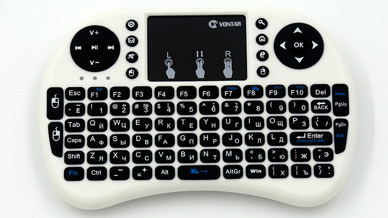 А это беспроводная клавиатура с продвинутым тачпэдом, заметно расширяющая возможности медиаприставки. Она также подключается с помощью USB-адаптера.