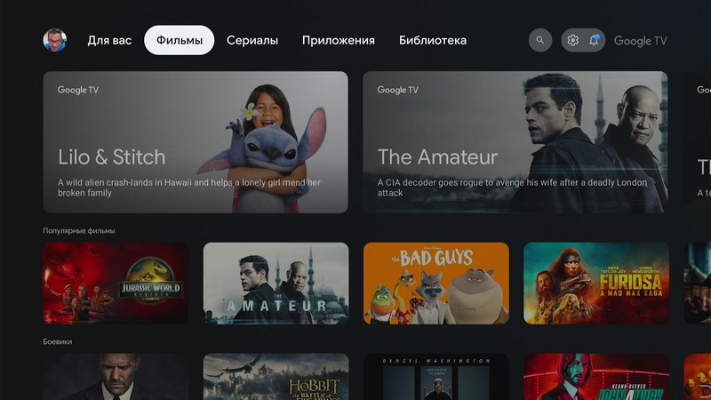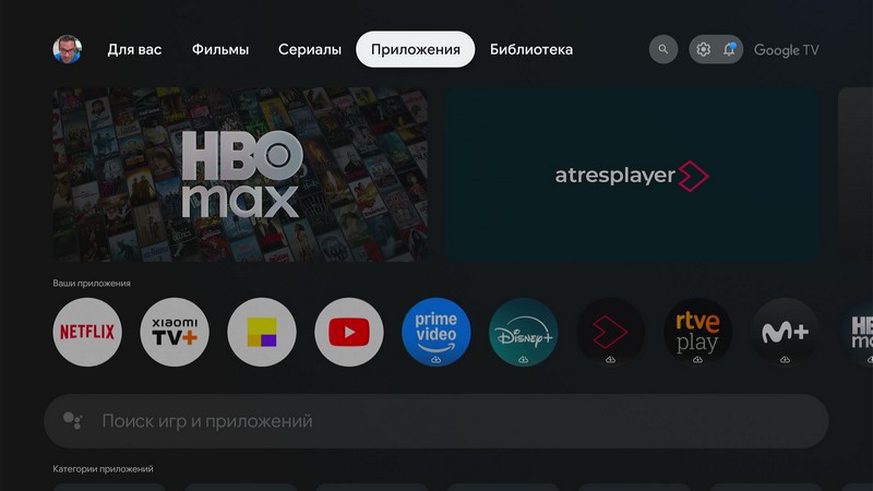 И вот главная страница медиаплеера. Основной раздел система будет подстраивать под ваши предпочтения. Меню сверху - подборка для вас, фильмы, сериалы, приложения, библиотека купленных фильмов и сериалов.