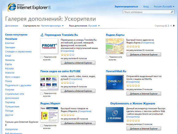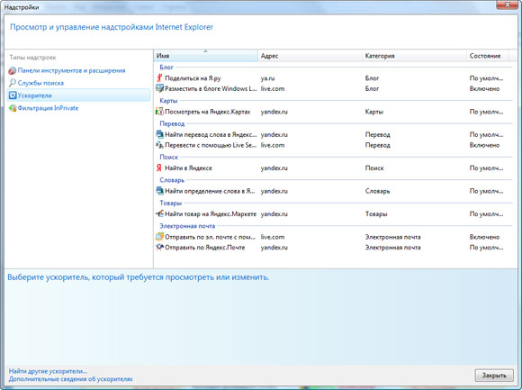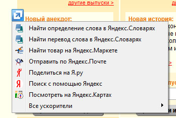 Я устанавливал версию с "Яндекс.Баром", поэтому в MSIE сразу было установлено несколько яндексовских ускорителей. Вообще говоря, ускорители - это просто какие-то внешние сервисы, куда передается выделенный фрагмент. То есть нечто вроде поисковых плагинов FireFox, однако в данном случае удобно то, что в плагин сразу передается выделенный текст, тогда как в FireFox его нужно вбивать в специальную строку.