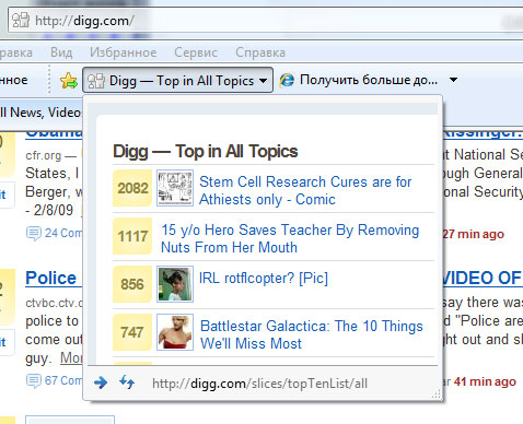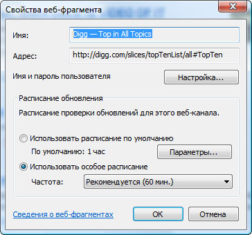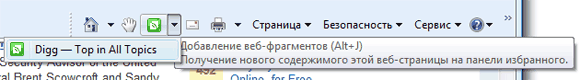 Совершенно новое для MSIE понятие, которое некоторым образом может заменить RSS. В чем его суть? Сначала веб-мастеры для своих сайтов создают эти веб-фрагменты (из ниоткуда сами по себе они не появятся). Затем, когда вы заходите на сайт с веб-фрагментом (например, на Digg.com), на панели инструментов появляется специальный зеленый значок - там, где обычно возникает значок RSS-потока.