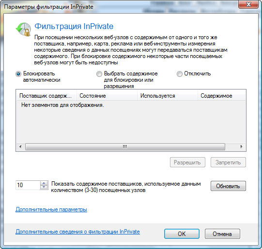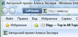 Для ситуации, когда вам требуется оставлять как можно меньше следов во время серфинга в Интернете, сделан специальный режим InPrivate. При этом не сохраняются файлы cookie, временные файлы Интернета, журнал просмотра и другие сведения. Окно браузера в этом режиме вызывается с помощью Ctrl+Shift+P. Когда сайт просматривается в InPrivate, в адресной строке появляется специальный значок.
