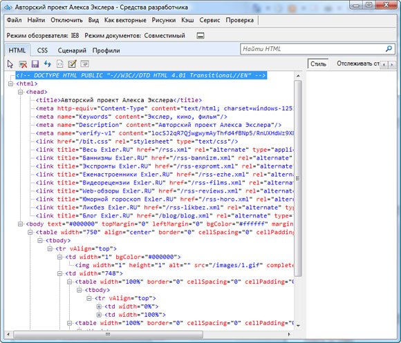 Теперь по клавише F12 на любом сайте можно вызвать окно средства разработчика - там выдается структурированный текст HTML, можно отслеживать стили и так далее.