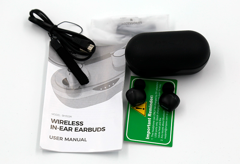Комплект поставки: зарядный кейс, наушники, кабель USB-microUSB, петелька для чехла, инструкция, два комплекта запасных амбушюр.