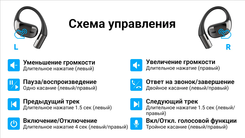 Производитель показывает вот такую схему управления наушниками. Она, что характерно, явно не слишком удобная (длительное нажатие - и громкость, и трек; однократное касание - пауза/воспроизведение), так в реальности еще и не совпадает с тем, что приводится на картинке.
