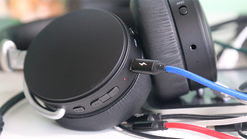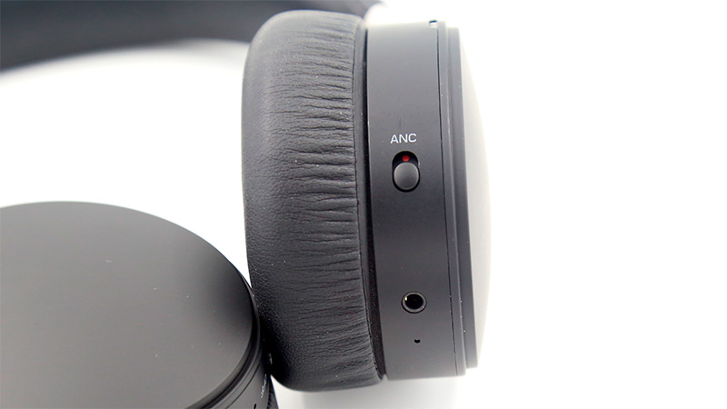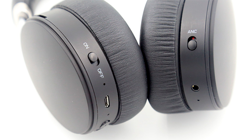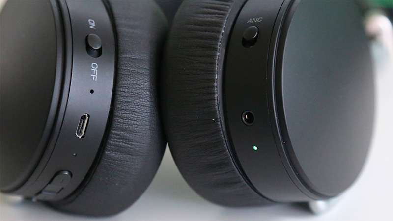 На левой чашке: кнопка включения шумодава, аудиовыход для проводного подключения, светодиод, показывающий включение шумодава.