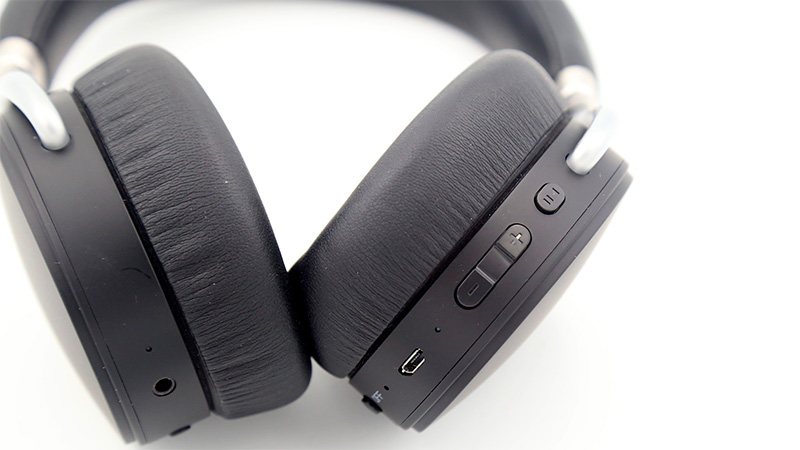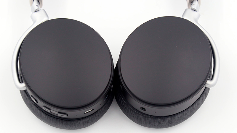 На правой чашке: кнопка включения-выключения наушников, микрофон, порт microUSB для зарядки, светодиод, показывающий зарядку, регулировка громкости и кнопка играть/пауза.