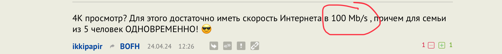 4K просмотр? Для этого достаточно иметь скорость Интернета в 100 Mb/s , причем для семьи из 5 человек ОДНОВРЕМЕННО! 😎