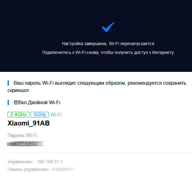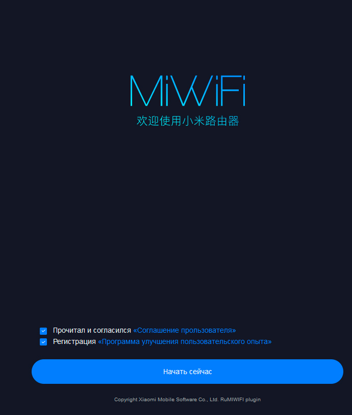 Первичное подключение будет на китайском с иероглифами (как и с роутером Redmi AX5 и с роутером Xiaomi Mi Router AX1800), потому что это китайская версия, но пусть вас это не пугает: там сначала нужно нажать синюю кнопку снизу, затем во втором окне задать имя сети и пароль (там и с иероглифами все вполне понятно), после чего нажать синюю кнопку снизу.