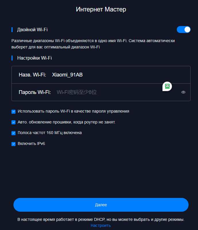 После нажатия кнопки "Начать сейчас", появится вот такое окно, в котором нужно поменять название сети (если не нравится предложенное) и задать пароль WiFi. Отмеченные опции лучше оставить включенными.