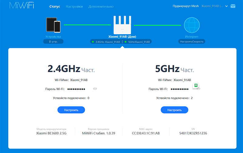 После того как на AX1800 загорелись лампочки работы устройства в сети, зашел в админку Xiaomi Router BE3600.