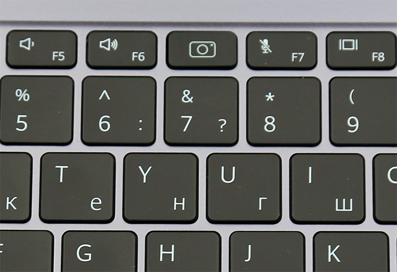Несколько слов о расположении камеры. Ее нет над экраном, так что некоторые пользователи считают, что у этого ноутбука (да и у всех остальных ноутбуков Huawei) камеры вообще нет. И здесь камеру реально непросто обнаружить, если не знать, где она находится. А находится она между клавишами F6 и F7 и в закрытом виде выглядит как обычная функциональная клавиша.