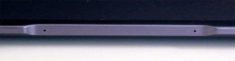 На нижней крышке - вентиляционные отверстия, под которыми скрываются один кулер, два блока отверстий стереодинамиков. Резиновые ножки нижней крышки довольно высокие, где-то 1,5 мм, так что динамики сильно глушиться не будут, тем более что у нижней крышки есть заметные скосы по бокам.